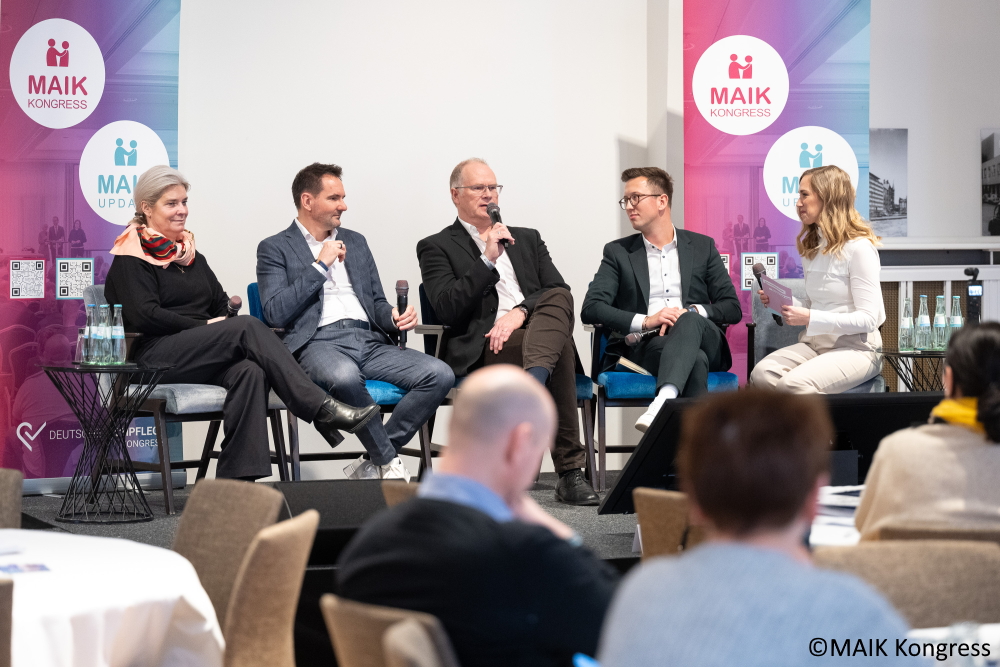 Diskussionsrunde „Die Befugniserweiterung für Pflegefachkräfte und Entbürokratisierung in der Pflege“ mit Simone Borchardt (MdB, CDU), Sven Wolfgram (Geschäftsführer, Geschäftsbereichsleiter ambulante Versorgung beim Bundesverband privater Anbieter sozialer Dienste e.V. (bpa), Prof. Dr. Marcel Sailer (Professor für Pflegewissenschaft an der TH Rosenheim), Ajdin Telalovic (Atmungstherapeut, Bereichsleitung in der DEUTSCHENFACHPFLEGE) und Moderatorin Kira Nordmann (Geschäftsführerin Certi.Care, Vorstand Intensivpflegeverband Deutschland e.V.). Foto: MAIK Kongress